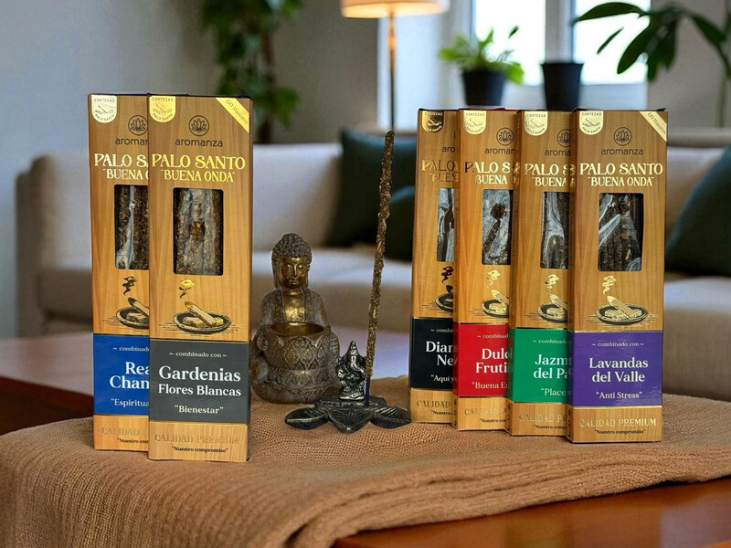 Cada caja contiene 8 varillas de sahumerio ecológico de aproximadamente 1 hora de duración cada una, que combinan las propiedades del Palo Santo con otras fragancias para distintos propósitos.
