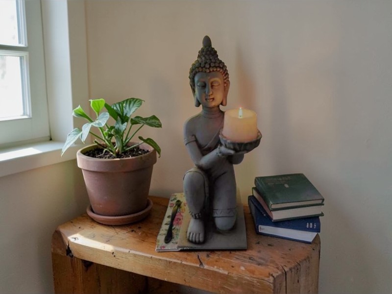 El portavela de Buda en rodilla (también conocido como Buda descansando o durmiendo sobre su rodilla) es una pieza decorativa que simboliza paz, relajación y equilibrio emocional. Esta postura específica está diseñada para brindar una sensación de completa tranquilidad al hogar.