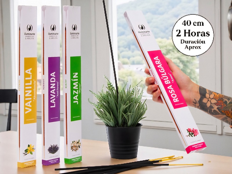 Iluminarte: Ofrece paquetes de 10 varillas de 40 cm con una duración de hasta 120 minutos (2 horas). Vienen en aromas como Palo Santo, Sándalo, Vainilla, Frutilla, Limón, Lavanda y Citronella.