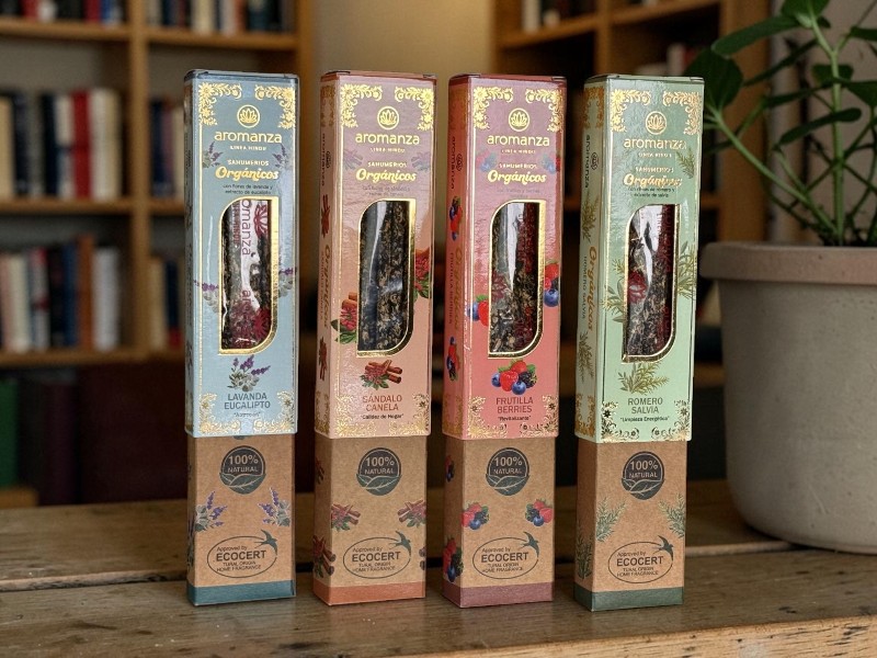 Disfruta de la exquisita fragancia de los sahumerios Aromanza India en su presentación de 8 varillas orgánicas.