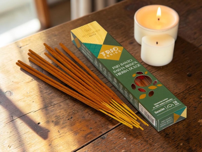 Los Sahumerios Trío Series Aromanza India son inciensos de calidad premium diseñados para la limpieza energética y armonización de ambientes. Cada varilla combina la fuerza del Palo Santo y la Salvia Blanca con un tercer aroma específico que potencia una intención particular.