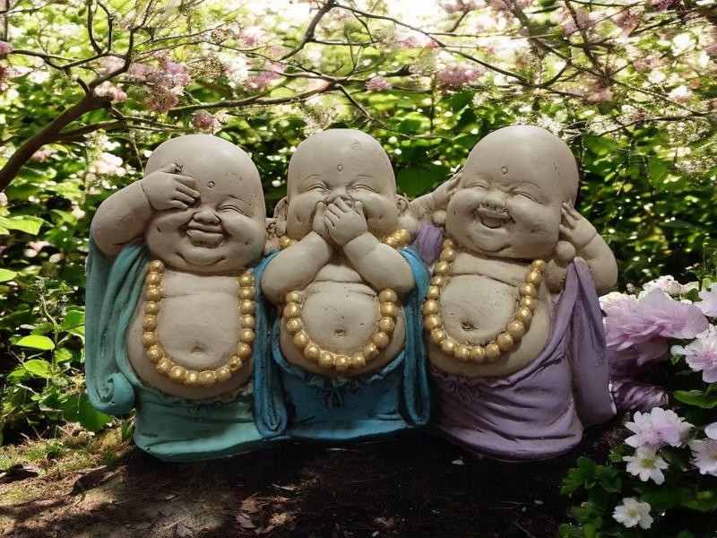 Este conjunto de tres figuras, a menudo referidas como “monjes budistas” o “buditas”, deriva de la leyenda japonesa de los tres monos sabios: Mizaru (no ver), Kikazaru (no oír) e Iwazaru (no decir). La simbología invita a evitar los pensamientos o acciones negativas para mantener la paz espiritual.