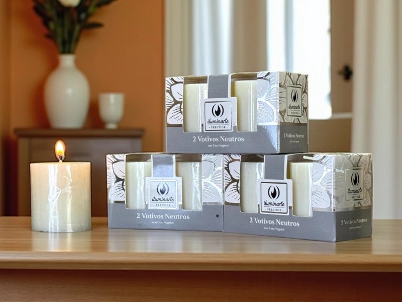 Set de 2 votivos neutros blancos de cera vegetal, con una duración de 24 horas cada uno. Perfectos para crear un ambiente relajante y acogedor en cualquier espacio.